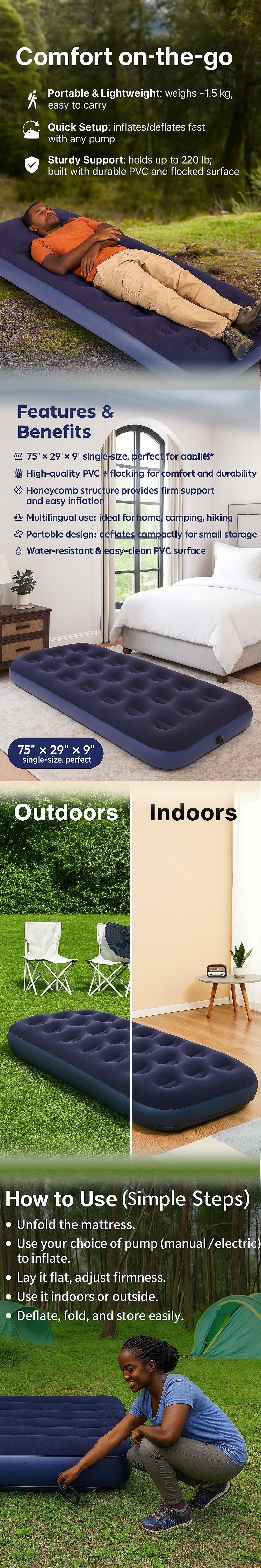 🛏️ Lalapo Popote kwa Starehe – Godoro la Hewa la Nyumbani & Camping!